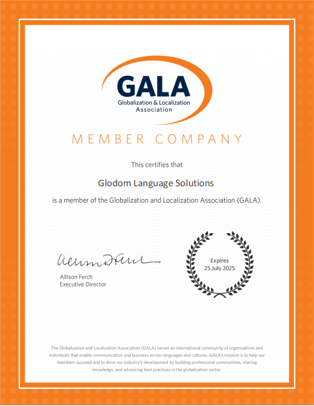 At Glodom Language Solutions, we are dedicated to bridging Global supplier of language and technology services. Today, it's our pleasure to share that we have been a member of the Globalization and Localization Association (GALA) for several years!