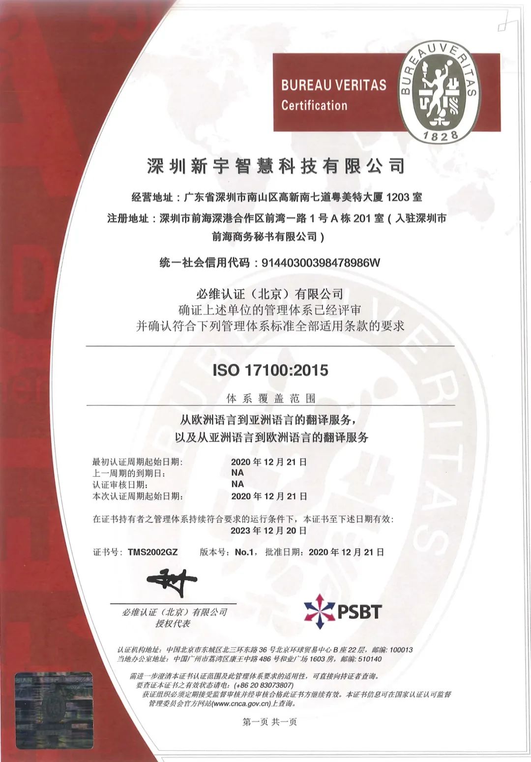 2020年尾聲,深圳新宇智慧科技有限公司正式通過了國際級的翻譯管理認(rèn)證標(biāo)準(zhǔn):ISO17100:2015。此項證書的授予,充分說明了新宇智慧無論從譯員水平、技術(shù)能力與服務(wù)質(zhì)量等各方面都嚴(yán)格遵循國際級最高翻譯的標(biāo)準(zhǔn),全方位保障客戶們在新宇智慧享受最優(yōu)質(zhì)的翻譯服務(wù)及解決方案。