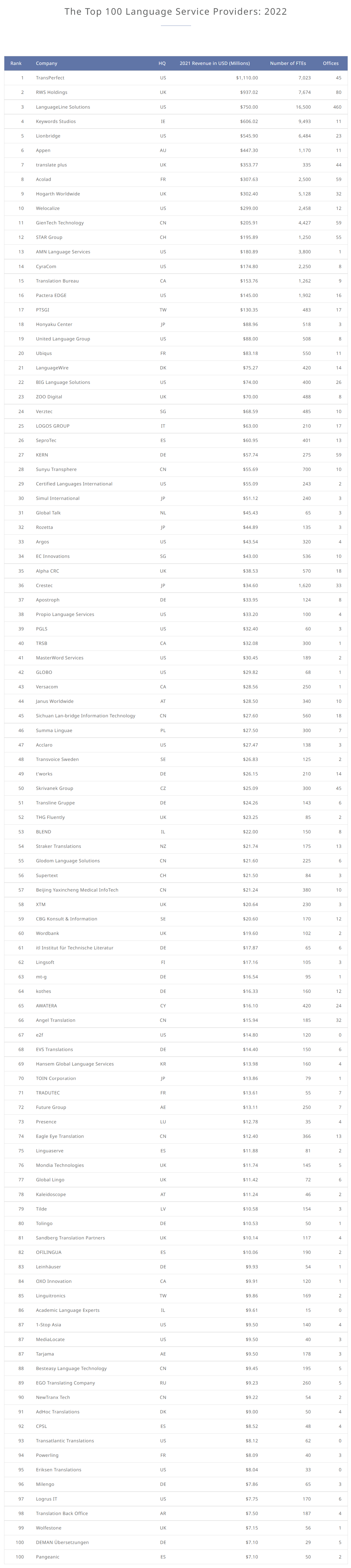 Appendix: The Top 100 Language Service Providers: 2022
