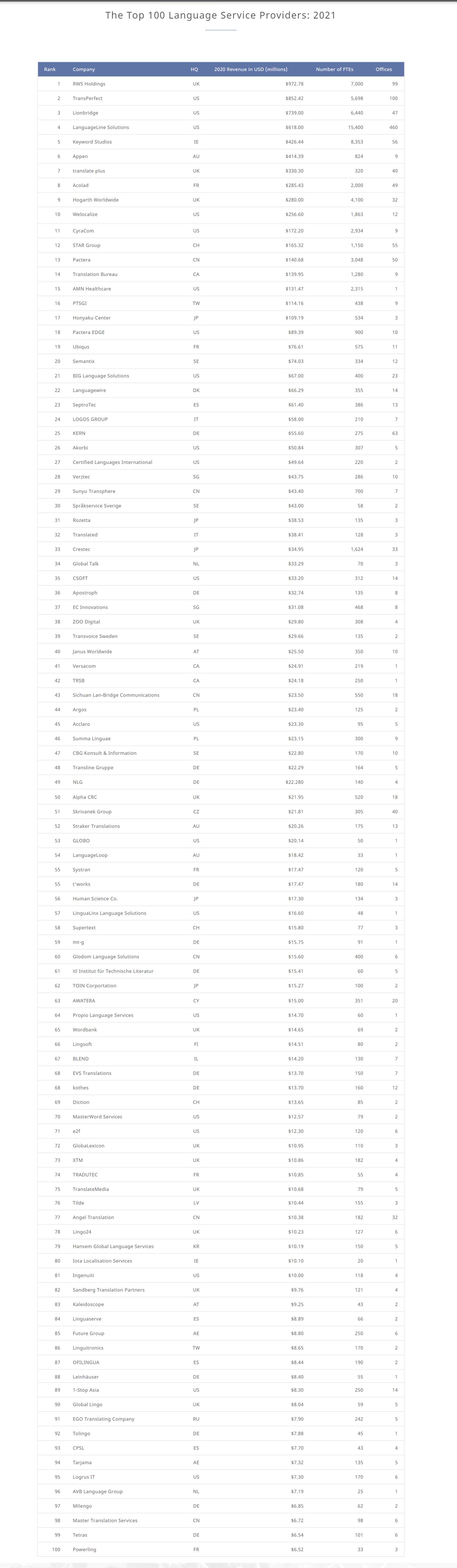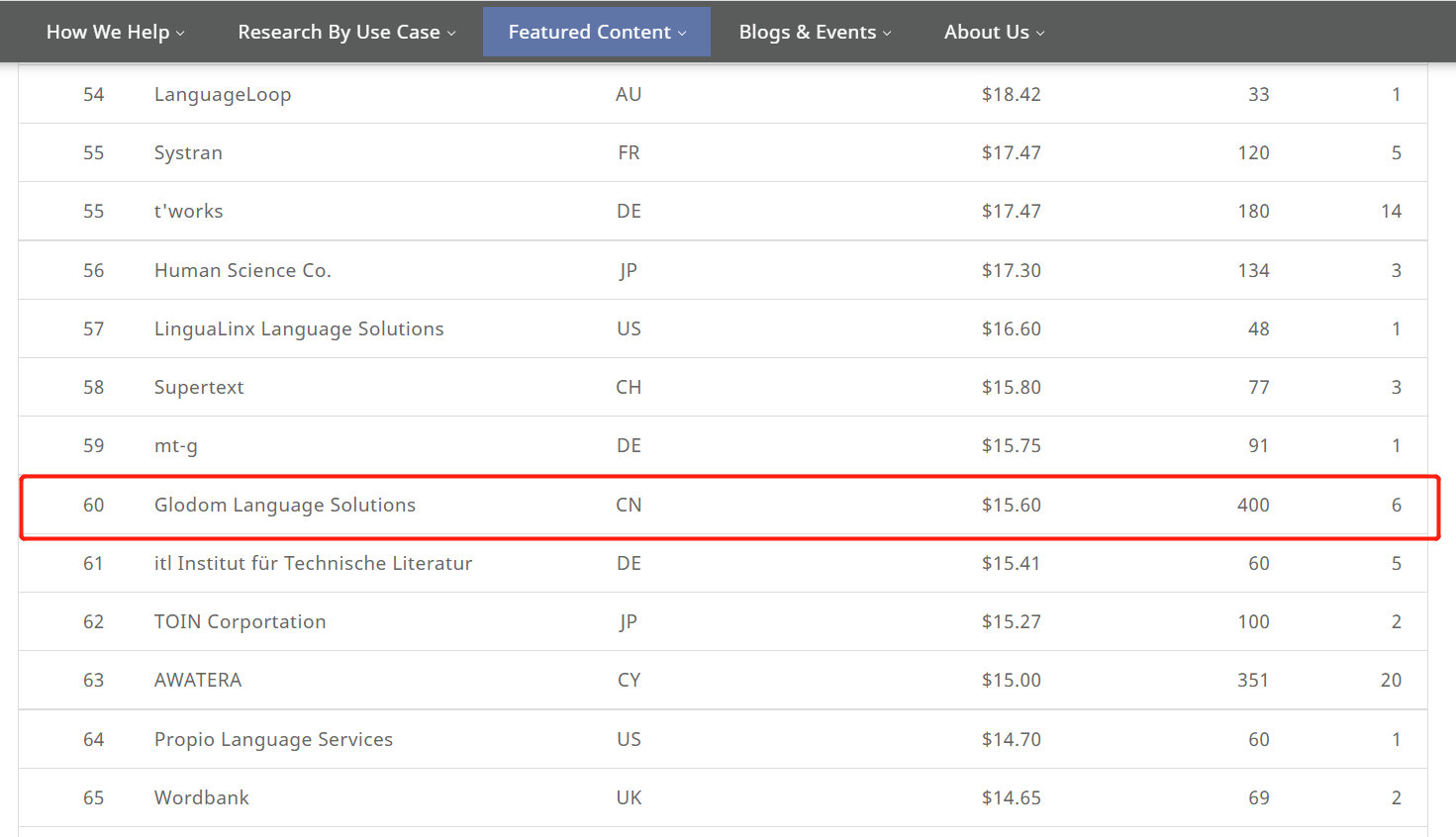 CSA Research, a U.S. language service research institute, published "The Largest Language Service Providers: 2021" chart today, with Glodom ranking 60th.