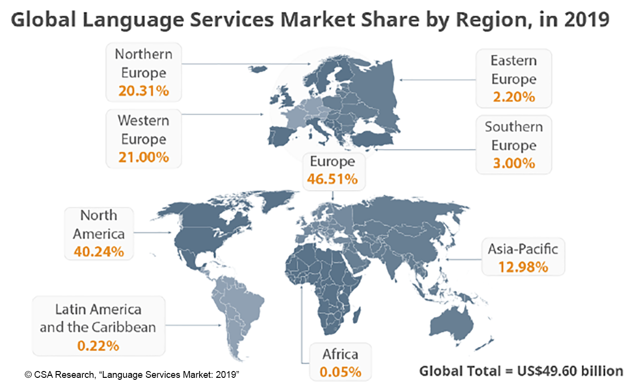 語(yǔ)言服務(wù)遍布世界各地,其中北美的市場(chǎng)份額最大。根據(jù)美國(guó)勞工統(tǒng)計(jì)局的統(tǒng)計(jì),僅美國(guó)就有3000多家公司,累計(jì)雇傭了55000多人從事語(yǔ)言服務(wù)工作。
